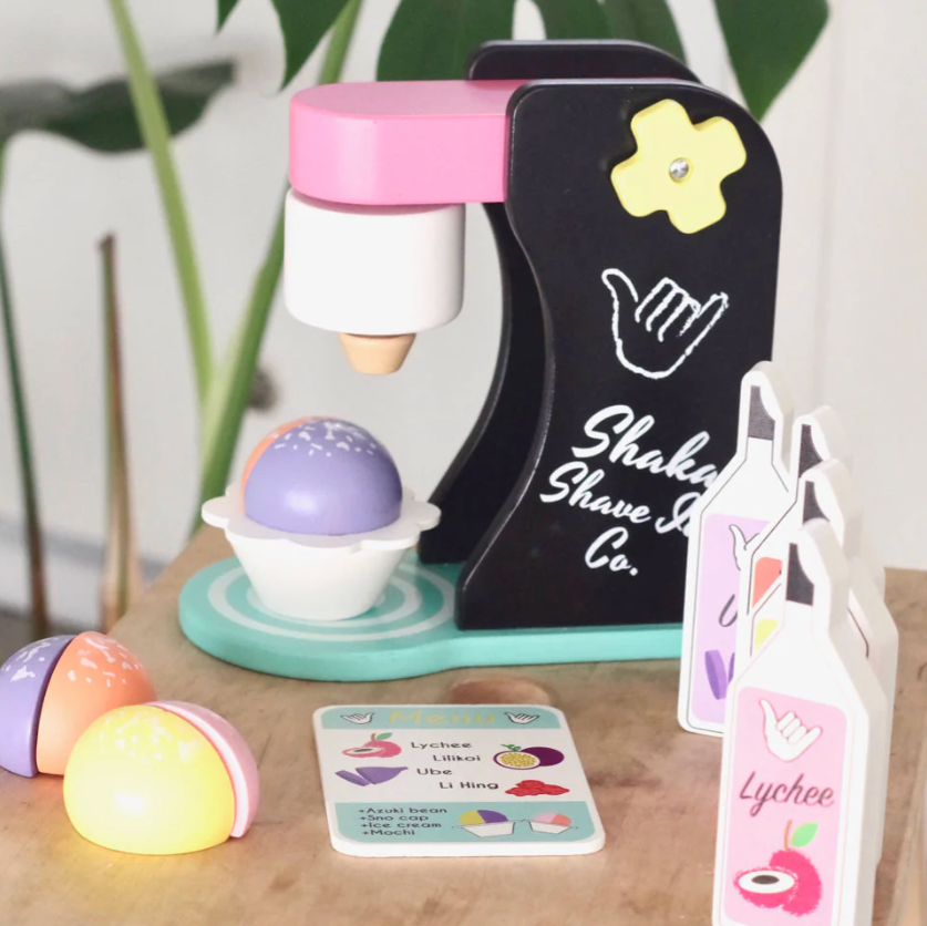Chill out island style with the Shaka Shave Ice wooden play set! Everyone's favorite sweet Hawai'i treat is now the perfect addition to your keiki kitchen.